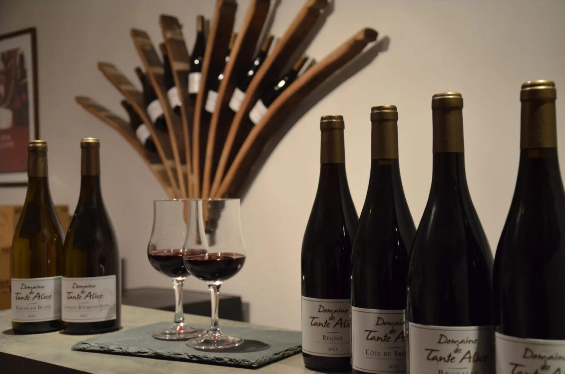 Producteurs de quatre crus — Côte de Brouilly, Brouilly « Pisse Vieille », Morgon et Beaujolais (rouge et blanc), nous avons le plaisir de vous présenter notre Domaine viticole : Domaine Tante Alice.